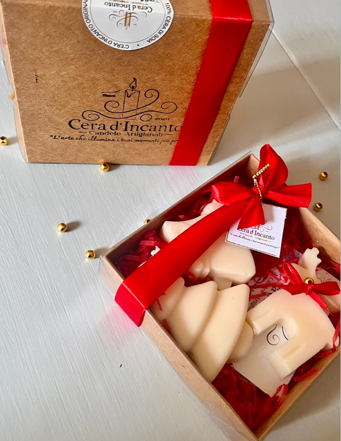Questa box natalizia include tre candele profumate a forma di renna di babbo Natale , campanella ed alberello , ideale per portare un po’ di gioia nelle vostre case .
