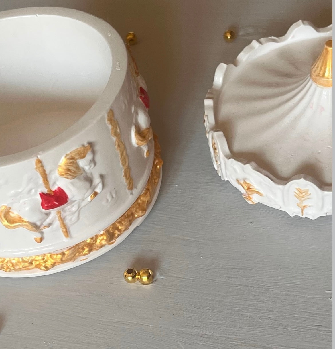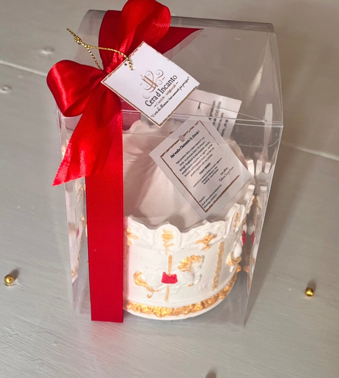 Candela a contenitore in ecoresina a forma di carosello , dipinto a mano , con colata di cera di soia 100% naturale e profumata .