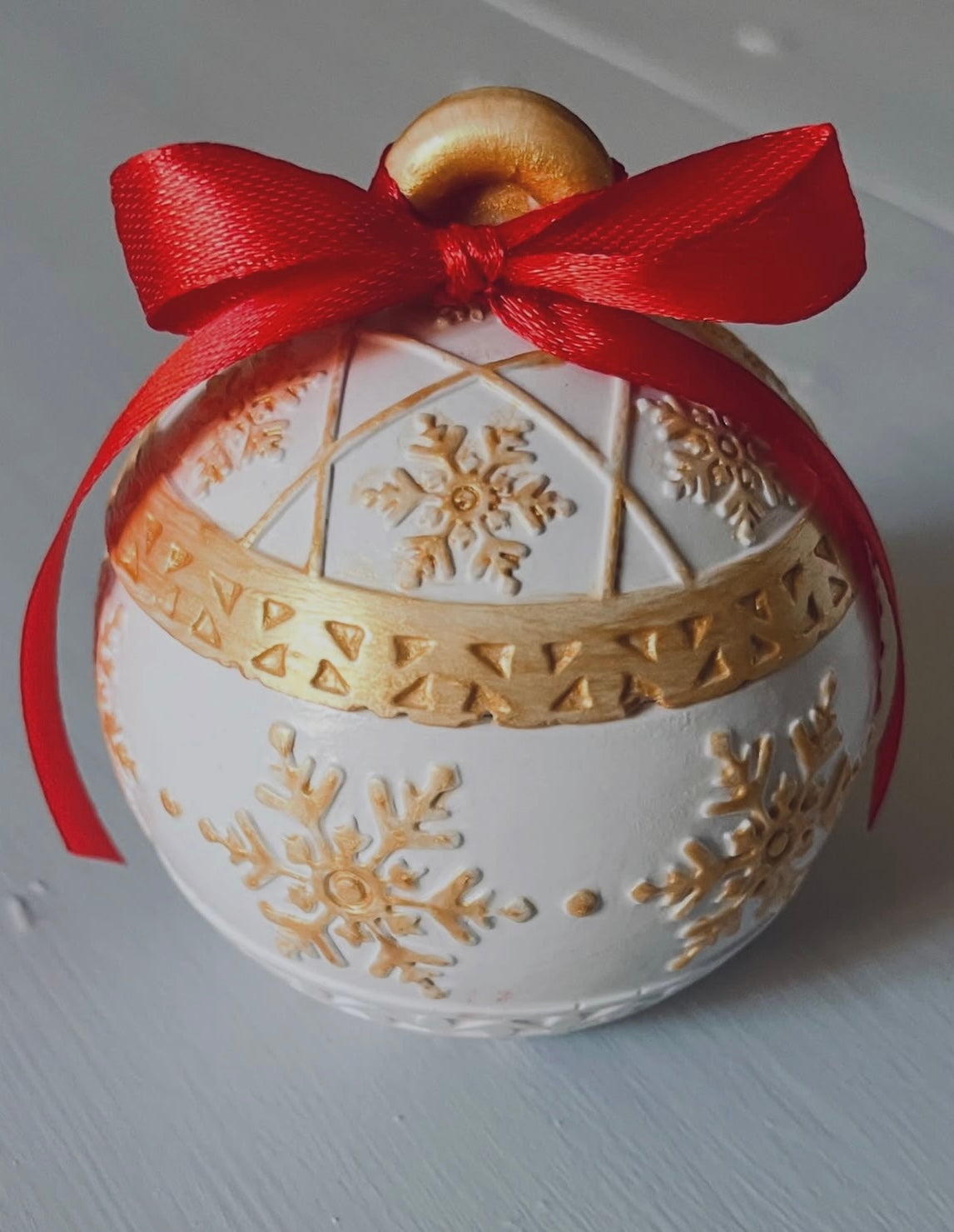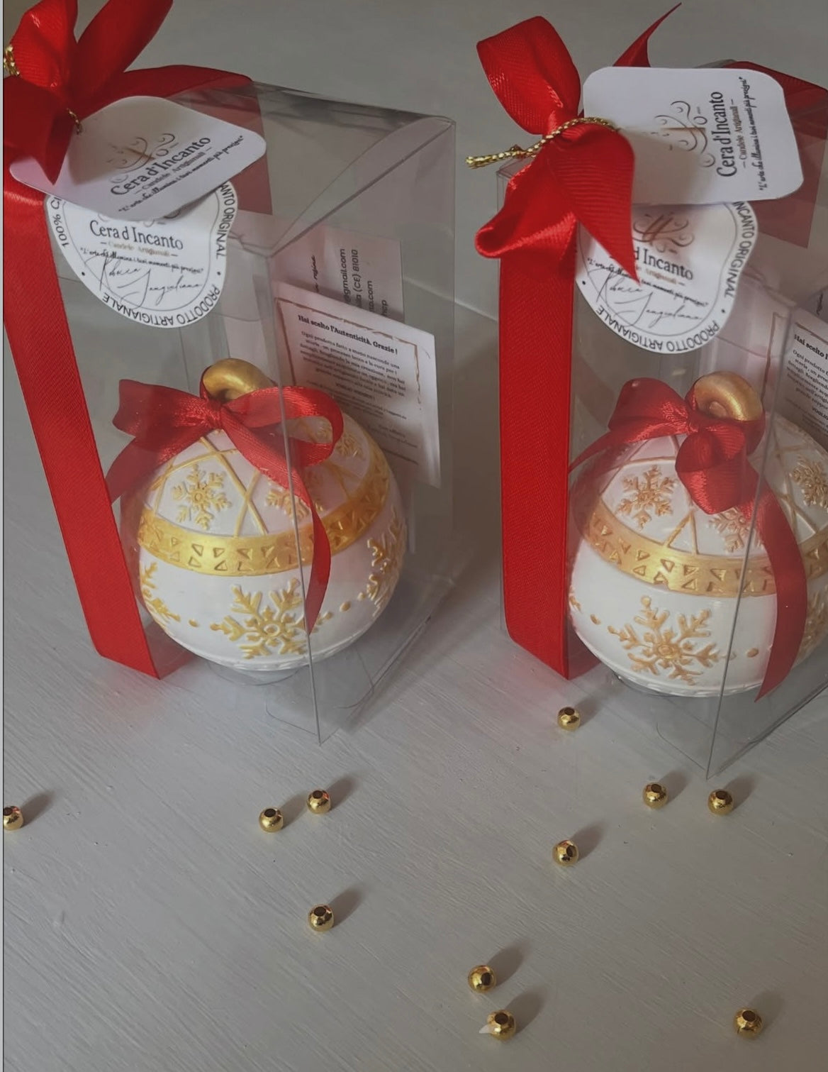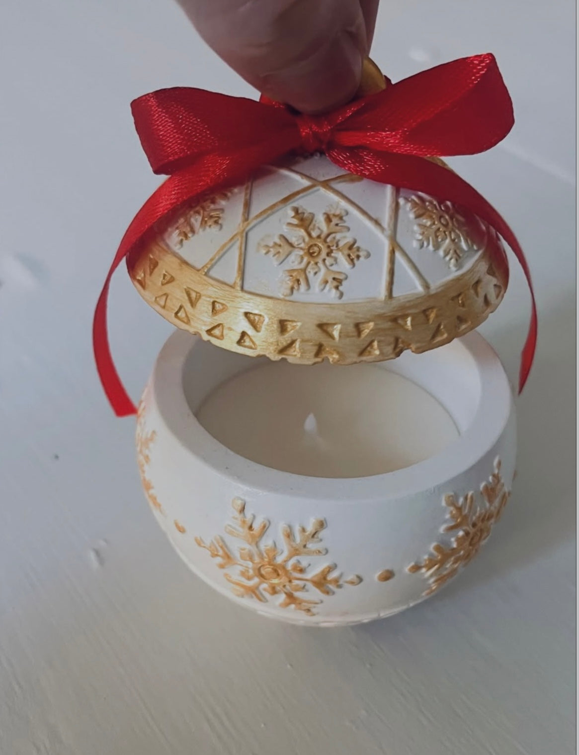 Contenitore a candela a forma di Pallina di Natale in ecoresina dipinta a mano con colata di cera di soia 100% naturale e profumata .